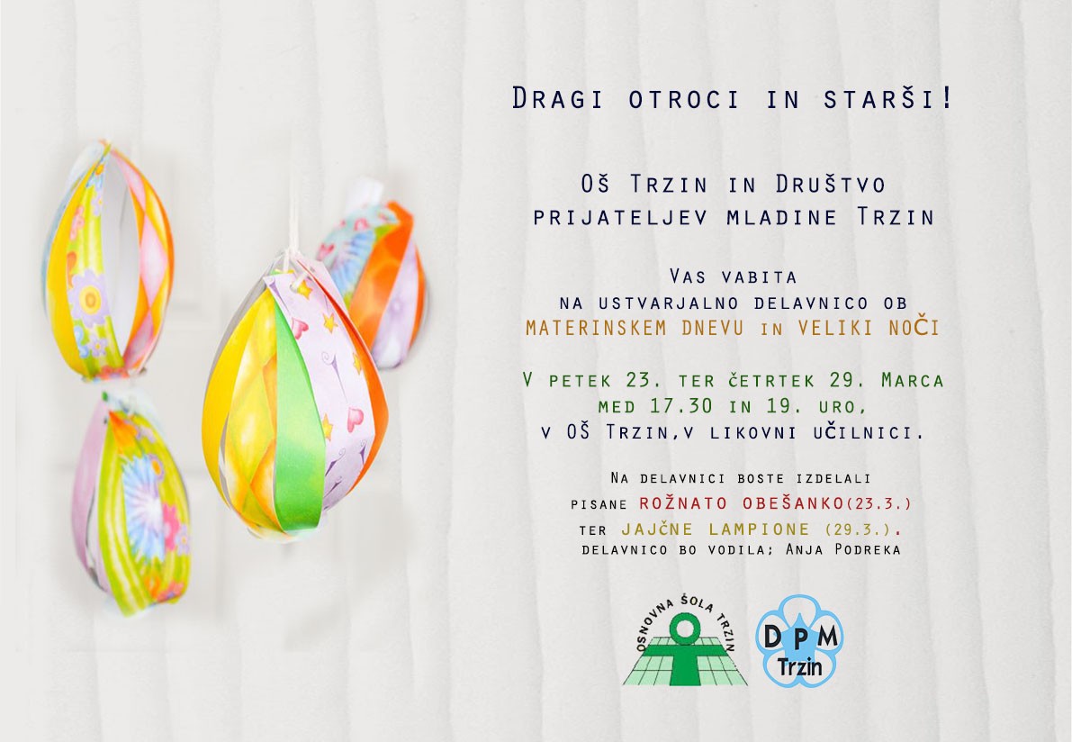 OŠ Trzin in Društvo prijateljev mladine Trzin vabita na ustvarjalno delavnico ob MATERINSKEM DNEVU IN VELIKI NOČI, v petek, 23. marca 2018, med 17.30 in 19.00 uro.