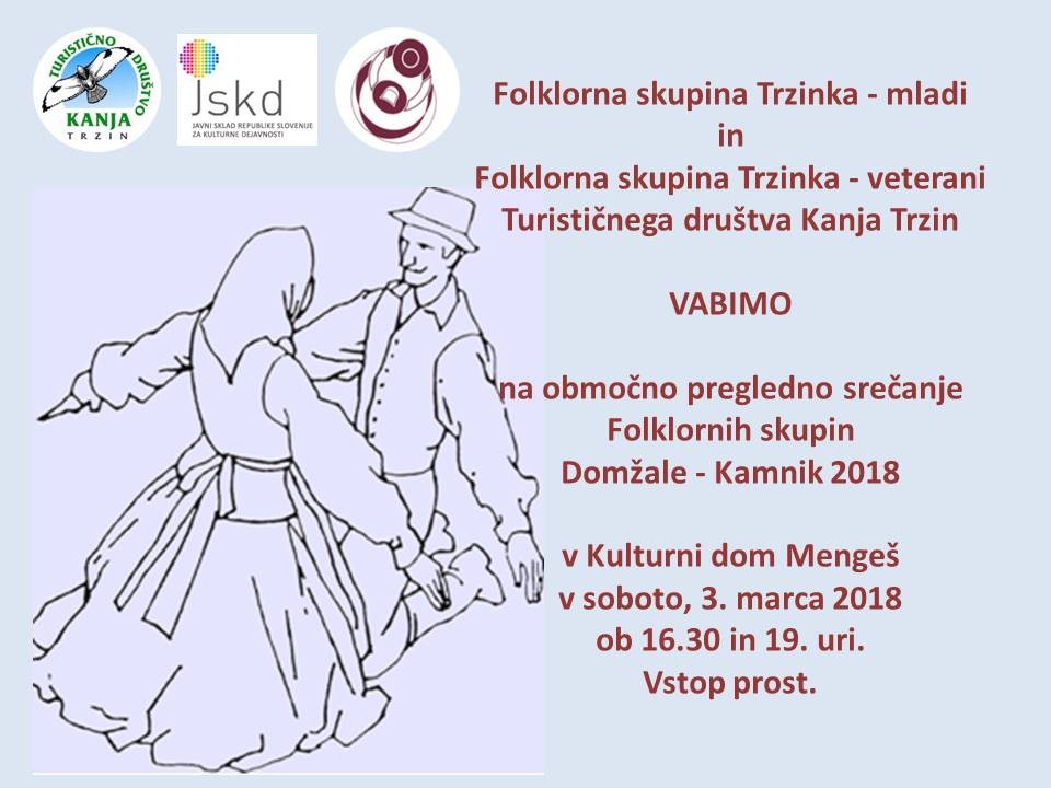 Folklorna skupina Trzinka - mladi in Folklorna skupina Trzinka - veterani TD Kanja Trzin vabita na območno pregledno srečanje Folklornih skupin Domžale - Kamnik 2018, v soboto, 3. marca 2018, ob 16.30 in 19.00 uri, v Kulturni dom Mengeš. Več informacij v vabilu!
