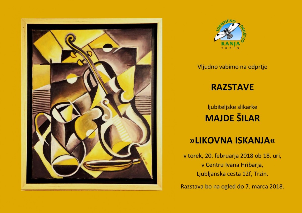 TD Kanja vabi na odprtje razstave ljubiteljske slikarke MAJDE ŠILAR: LIKOVNA ISKANJA, ki bo v torek, 20. februarja 2018, ob 18.00 uri, v Centru Ivana Hribarja. Razstava bo na ogled do 7. marca 2018.