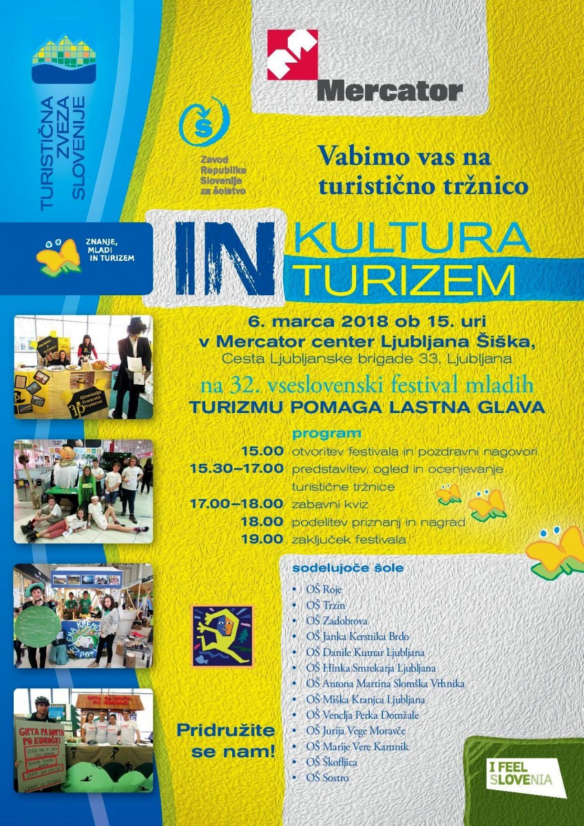 Turistično društvo Kanja Trzin in Osnovna šola Trzin vabita na TURISTIČNO TRŽNICO KULTURA IN TURIZEM, TURIZMU POMAGA LASTNA GLAVA, v torek, 6. marca 2018, ob 15.00 uri v Mercator center Ljubljana šiška.