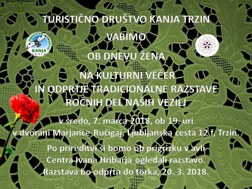 TD Kanja vabi na KULTURNI VEČER OB DNEVU ŽENA IN ODPRTJE TRADICIONALNE RAZSTAVE ROČNIH DEL VEZILJ, v sredo, 7. marca 2018, ob 19.00 uri, v dvorani Marjance Ručigaj.