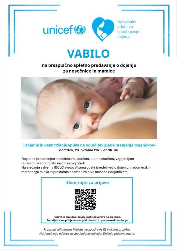 Unicef vabi na BREZPLAČNO SPLETNO PREDAVANJE O DOJENJU ZA NOSEČNICE IN MAMICE, ki bo v četrtek, 23. 10. 2025, ob 16. uri.