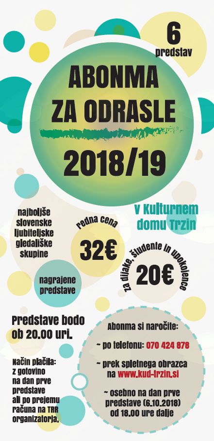 Vse predstave bodo na sporedu s pričetkom ob 20.00 uri v Kulturnem domu Trzin. Abonma po ugodnih redni ceni 32€ in še ugodnejši znižani ceni 20€ (za dijake, študente in upokojence z veljavno izkaznico) je mogoče vpisati do vključno 6. oktobra 2018 prek spletne strani organizatorja KUD Franc Kotar Trzin www.kud-trzin.si, po telefonu 070 424 878 ali osebno na dan prve predstave od 18. ure dalje v Kulturnem domu Trzin, kjer pa bo plačilo mogoče le z gotovino. Obenem bodoče abonente obveščamo, da bodo redni abonmaji prenosljivi, znižani abonmaji pa izdani na imena abonentov. Redne cene vstopnic bodo za posamezno predstavo po 8€. Pomembna novica iz kulturnih vrst je tudi ta, da se v novi sezoni 2018/19 ukinja vstopnica 2-za-1 oz. 'plača eden, gledata dva', ki je bila na voljo za dijake, študente in upokojence do sedaj, zato vsi navedeni še posebej vabljeni k nakupu abonmaja.
