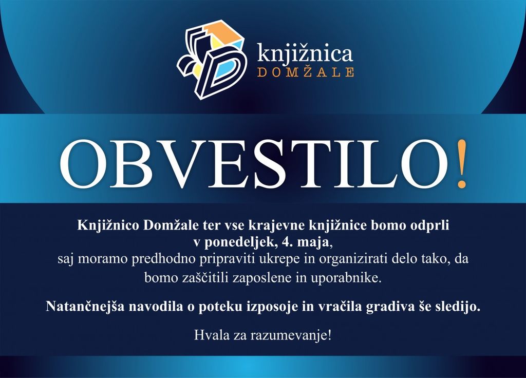 Obvestilo o ponovnem odprtju Knjižnice Domžale in vseh njenih enot.