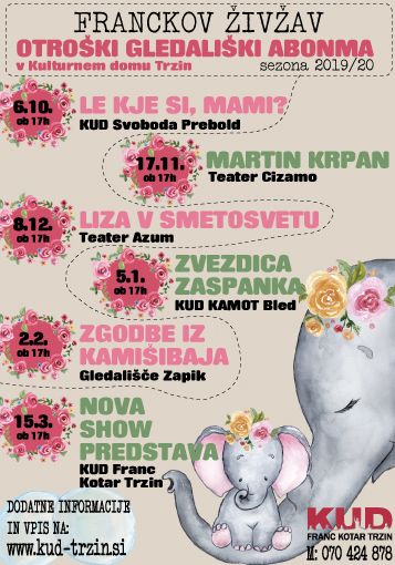 Od oktobra do marca bo v okviru otroškega abonmaja Franckov živžav, kot že leta dolgo abonma nosi ime, na sporedu 6 predstav. Letošnja novost je, da se čas vseh predstav premika na 17. uro nedeljskih popoldnevov. V okviru Franckovega živžava bodo nastopili gledališčniki iz Bleda, Prebolda, Ljubljane in pa kar tri gledališke skupine iz Trzina - Teater Azum, Show skupina KUD Franc Kotar Trzin s svojo novo predstavo in Teater Cizamo, ki deluje v okviru KUD Cirkuško gledališče. Razpored je predstav je razviden iz slike.