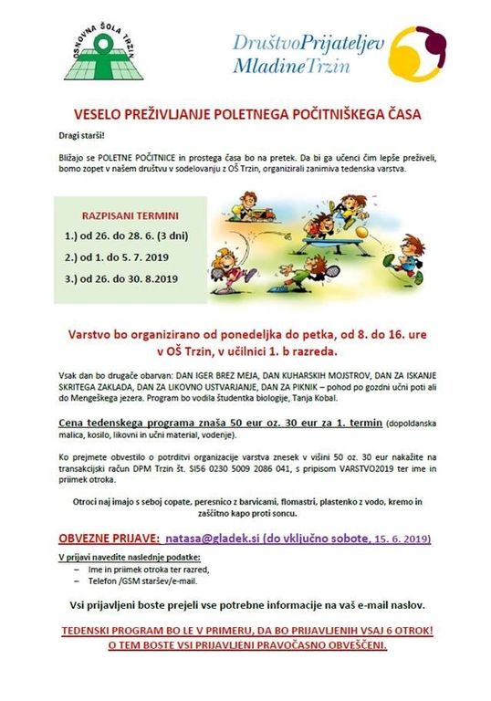 Društvo prijateljev mladine in Osnovna šola Trzin organizirata POLETNO POČITNIŠKO VARSTVO.